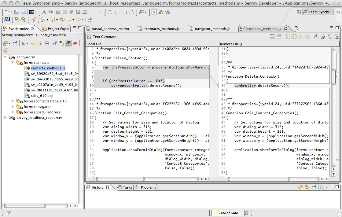 The screen shot above shows my contacts_methods.js file in the Text Compare window. There is a difference between the two delete_contact methods. (The one in my local workspace asks if the user wants to delete before deleting, while the one on the repository just deletes without asking any questions.)