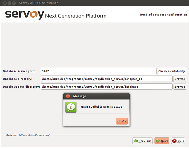 Now, that ‘check availability’ button checks if the default Pg port is already in use. If it is it tries the next one, and so on. So somehow it seems to think that ports 5432 all the way to 65535 is already in use. I suggest you file this as a bug with Servoy because I find that hard to believe that this is the case.